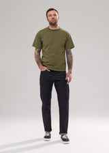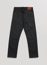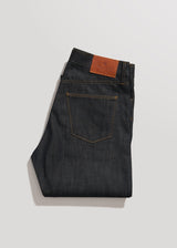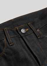 Rolled and tucked belt loops / Narrow selvedge line / Lock-stitched yoke and waistband / Chain-stitched hem / Double-pronged copper rivets with black finish / High-density serging on inside fly and inseam / Shockoe tobacco leaf logo-stamped buttons / Veg-tanned leather patch from small-batch family producer in North Carolina / Hand-numbered and signed / Free repairs for the life of the jean