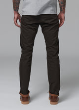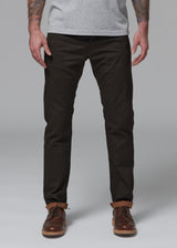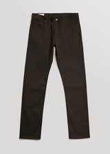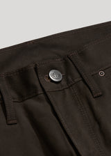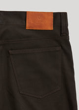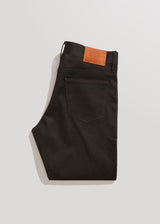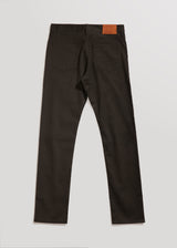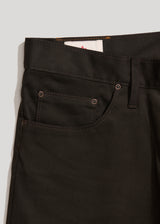 Raw 9 oz. double-faced twill from Spain / Charcoal warp - Olive weft / 98% Cotton, 2% Lycra