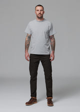 Rolled and tucked belt loops / Lock-stitched yoke and waistband / Chain-stitched hem / Two-piece waistband / Leather-backed rivets / Lined Back pockets / Front pocket protector /Double-pronged copper rivets with black finish / High-density serging on inside fly and inseam / Shockoe tobacco leaf logo-stamped rivets and buttons / Veg-tanned leather patch from small-batch family producer in North Carolina / Hand-numbered and signed / Free repairs for the life of the jean
